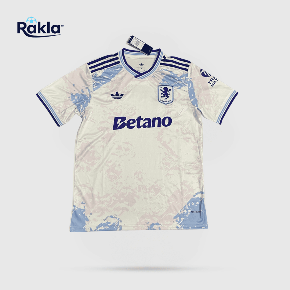 - الشعارات: شعار أديداس (Adidas) باللون الأزرق الداكن، وشعار نادي أستون فيلا (Aston Villa) على الصدر الأيمن، وشعار الراعي الرئيسي (Betano) باللون الأزرق الداكن في منتصف التيشيرت، وشعار (Rakla) في الزاوية العلوية اليسرى.