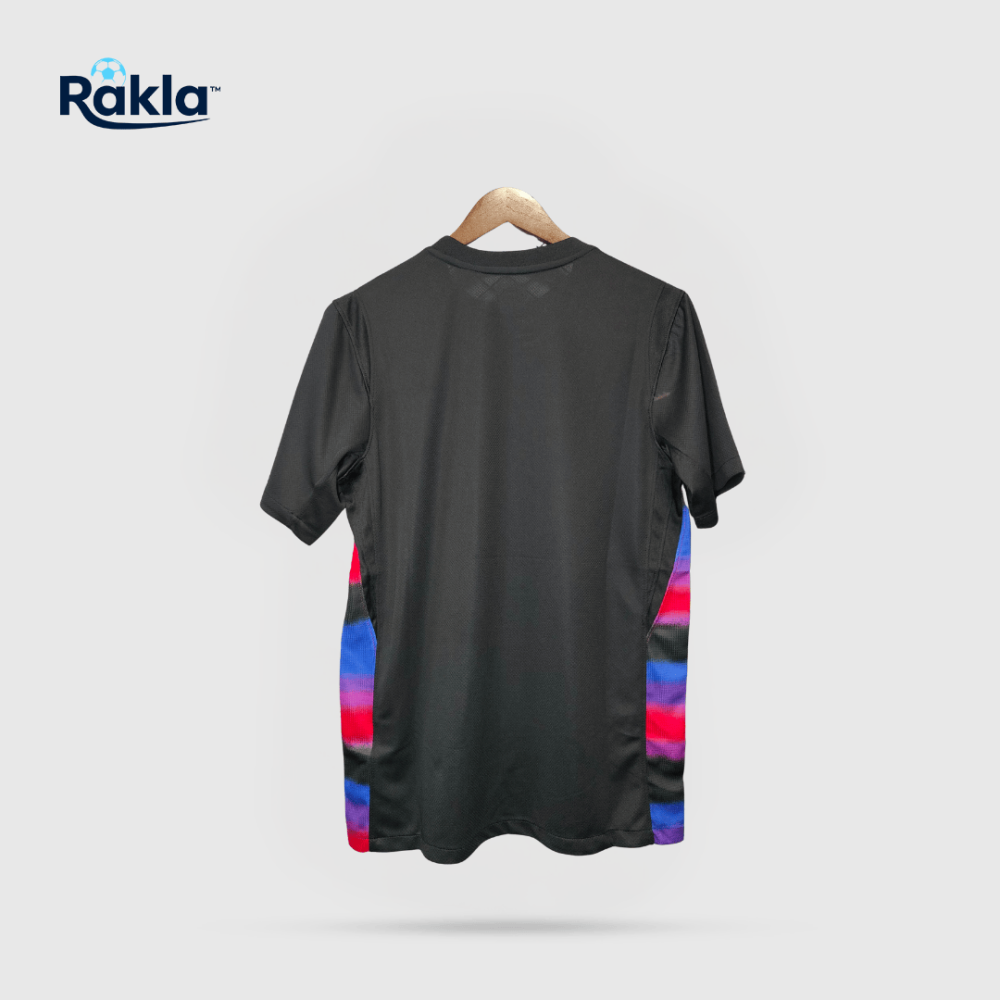 - اللون: الأسود هو اللون الأساسي مع تداخل بسيط من اللون الأزرق والأحمر والبنفسجي بشكل بسيط على الأطراف، مع أكمام قصيرة وياقة واسعة ومريحة بالإضافة إلى وجود شعار النادي عليه.
