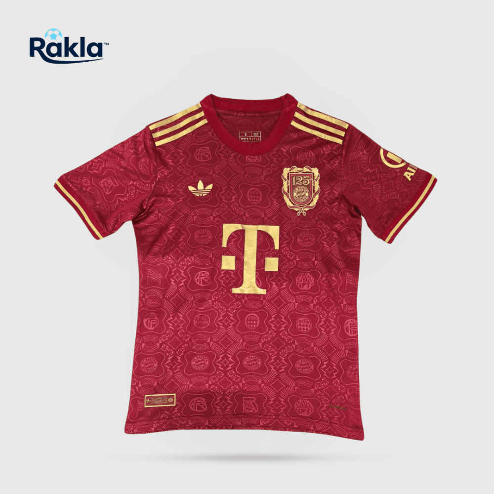 • تيشيرت بايرن ميونخ 125 سنة، وهو يتكون من اللون الأحمر مع بعض لمسات من اللون الذهبي موجودة بدقة على الأكمام القصيرة والياقة، بالإضافة إلى وجود شعار النادي والراعي الرسمي على التيشرت.