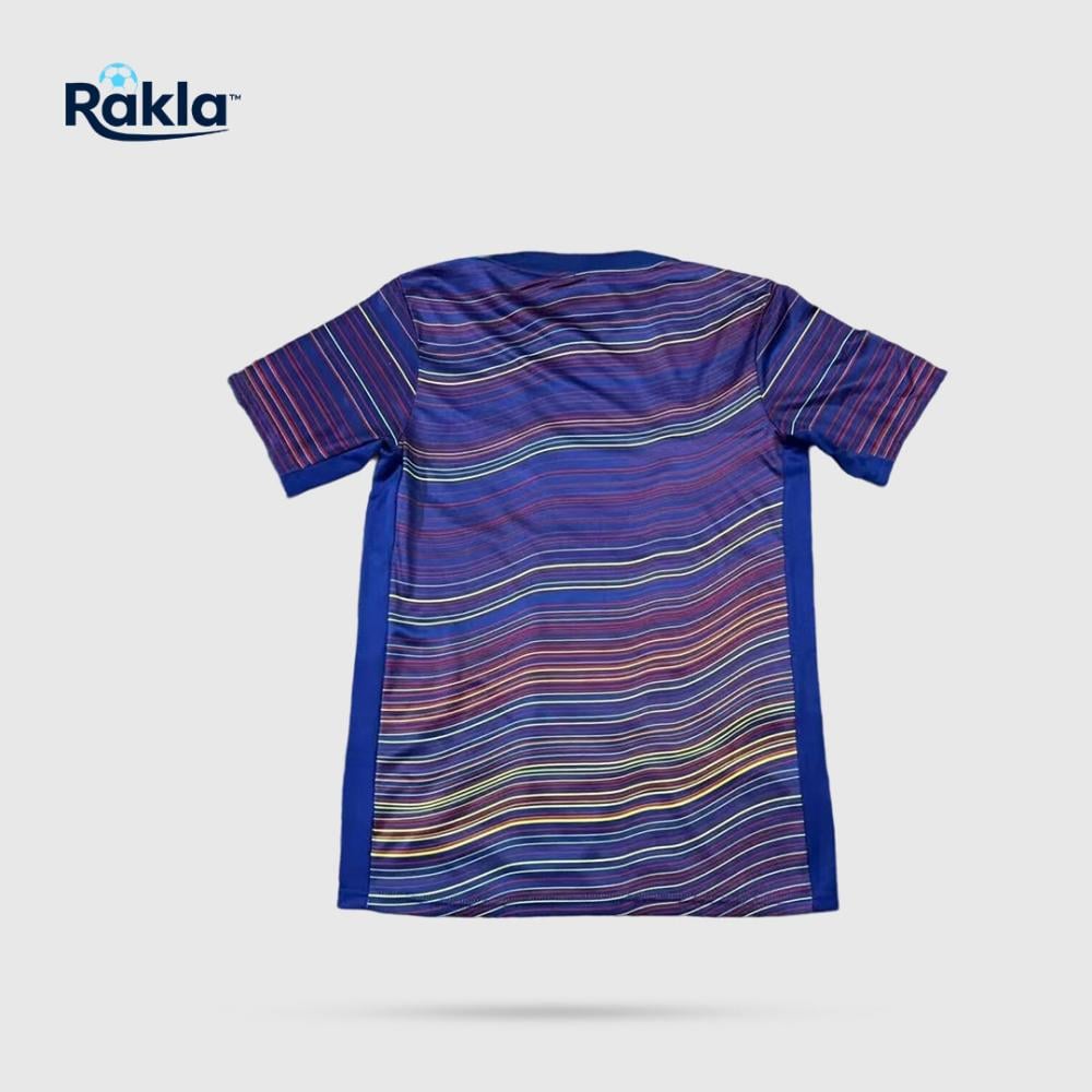 - الألوان: اللون الأساسي هو الأزرق الداكن وجاء مزين بخطوط أفقية مموجة متعددة الألوان وهي الأصفر والأحمر والوردي والبنفسجي مما تمنح التيشيرت مظهر ديناميكي مستوحى من الحركة والطاقة.