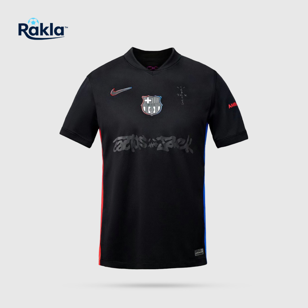- التصميم: يتميز التيشيرت بألوان جريئة ومبتكرة مستوحاة من روح برشلونة وإبداع علامة ترافيس، مع خطوط هندسية حديثة وشعار النادي البارز.