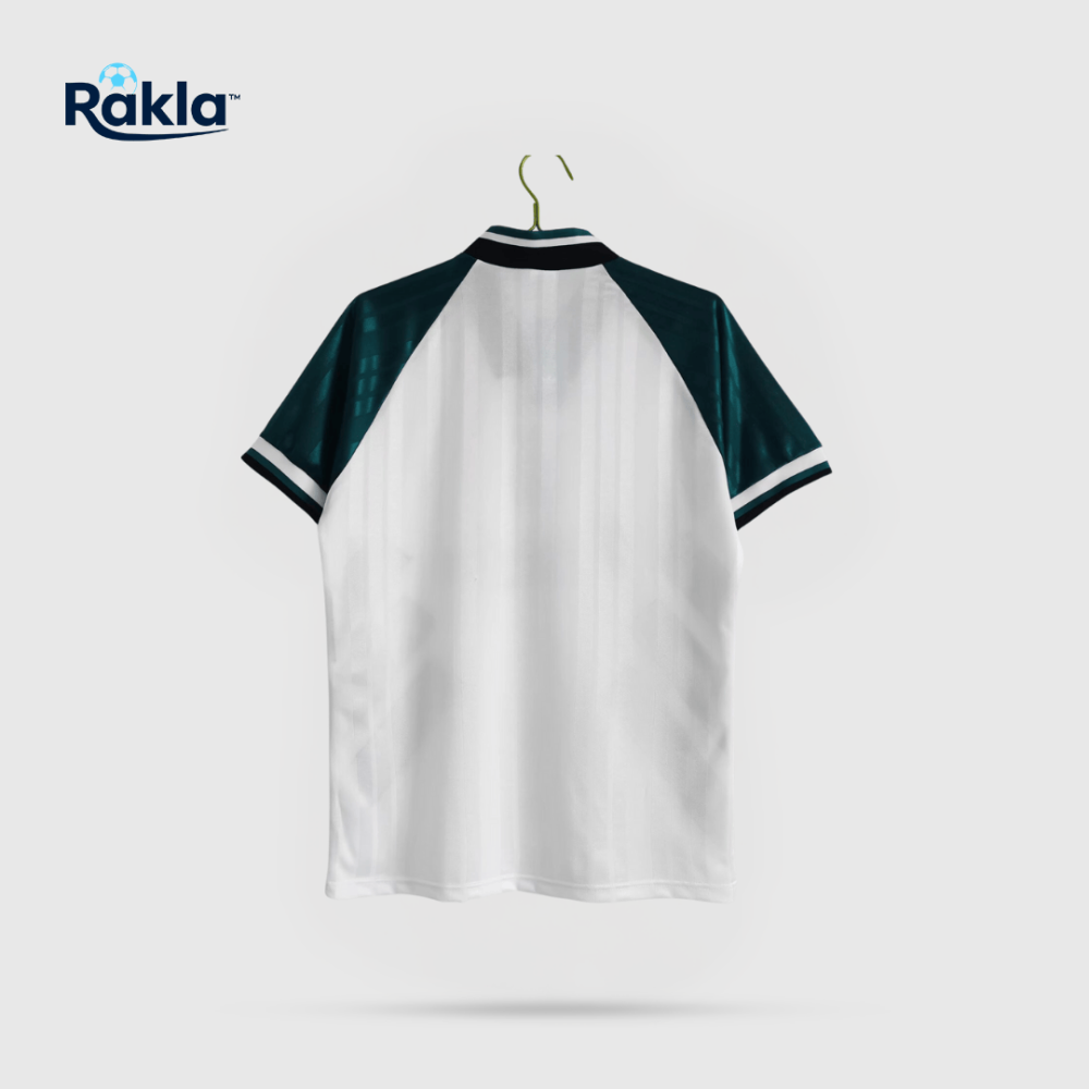 - التصميم: يتميز بتصميم كلاسيكي نظيف باللون الأبيض مع أكمام وياقة باللون الأخضر الداكن الأنيق وخطوط سوداء جريئة بشكل مائل على الجانبين.