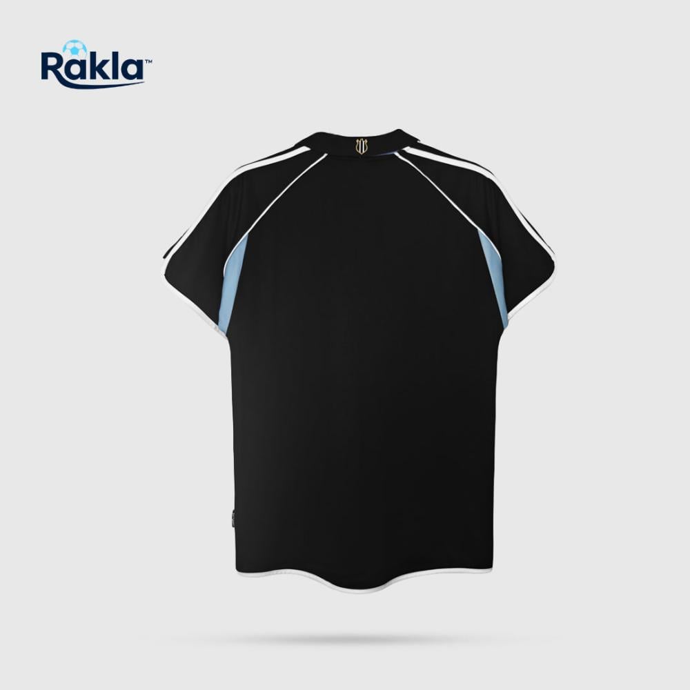- التصميم: قميص نيوكاسل باللون الأسود، بياقة بولو سوداء بحافة V بيضاء، مع خطوط بيضاء على الكتفين وتفاصيل زرقاء سماوية على جانبي الصدر.