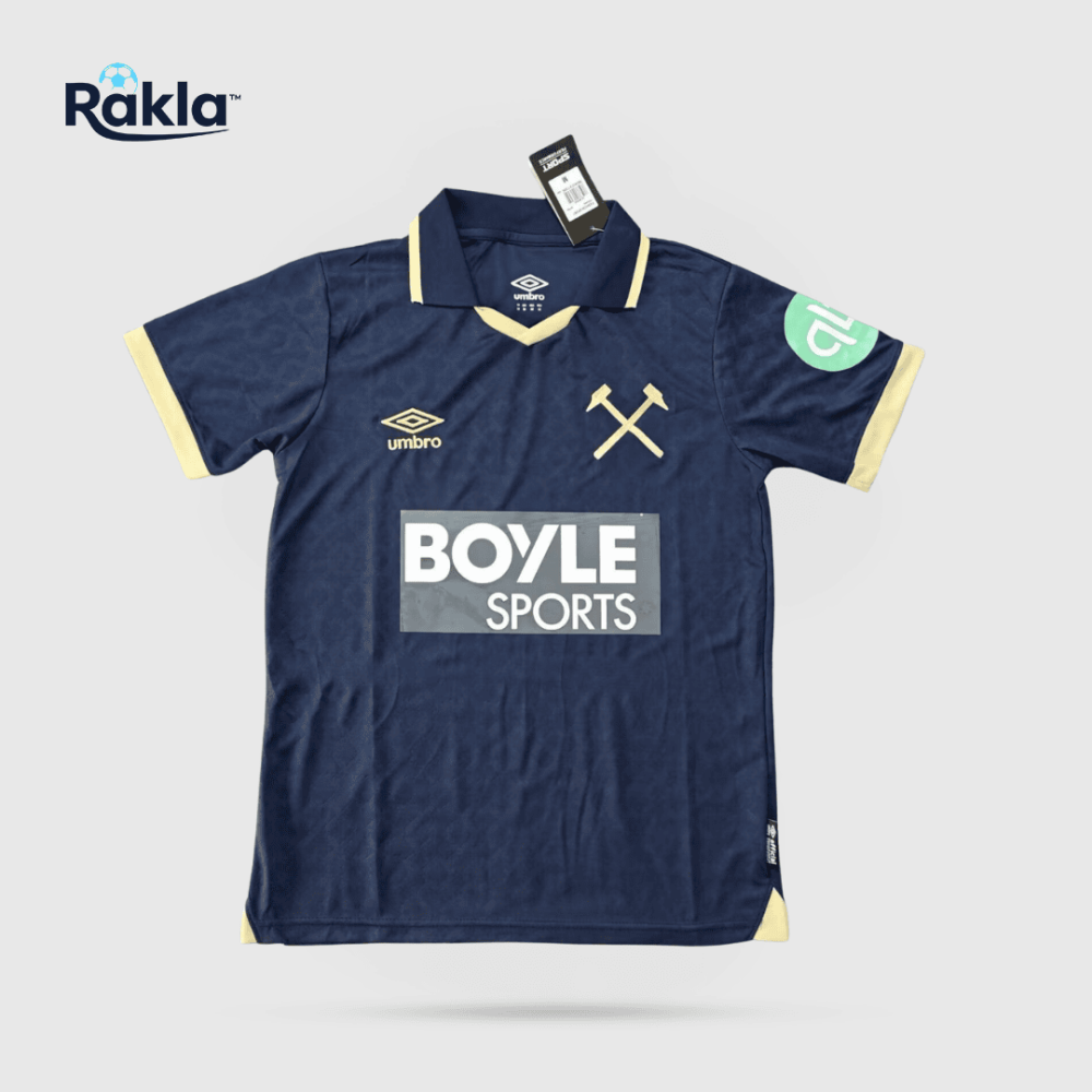 - الشعار: شعار نادي وست هام وشعار الشركة المصنعة "Umbro" مطبوعان بجودة عالية، بالإضافة إلى شعار الراعي BoyleSports.
