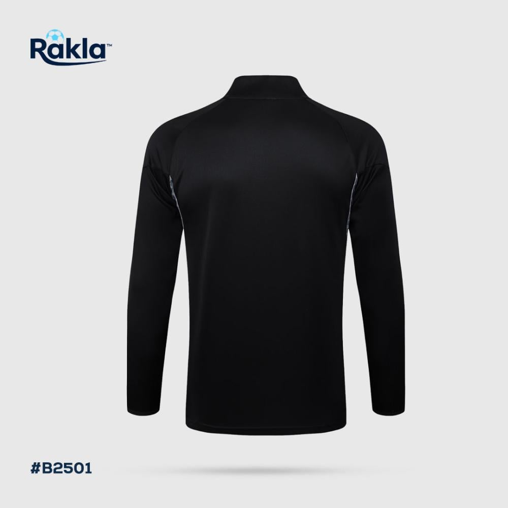 • التصميم: قميص تدريب بأكمام طويلة وقصة رياضية دقيقة، يتميز بياقة عالية مع ربع سحاب للتحكم بالتهوية وتفاصيل جانبية بيضاء.