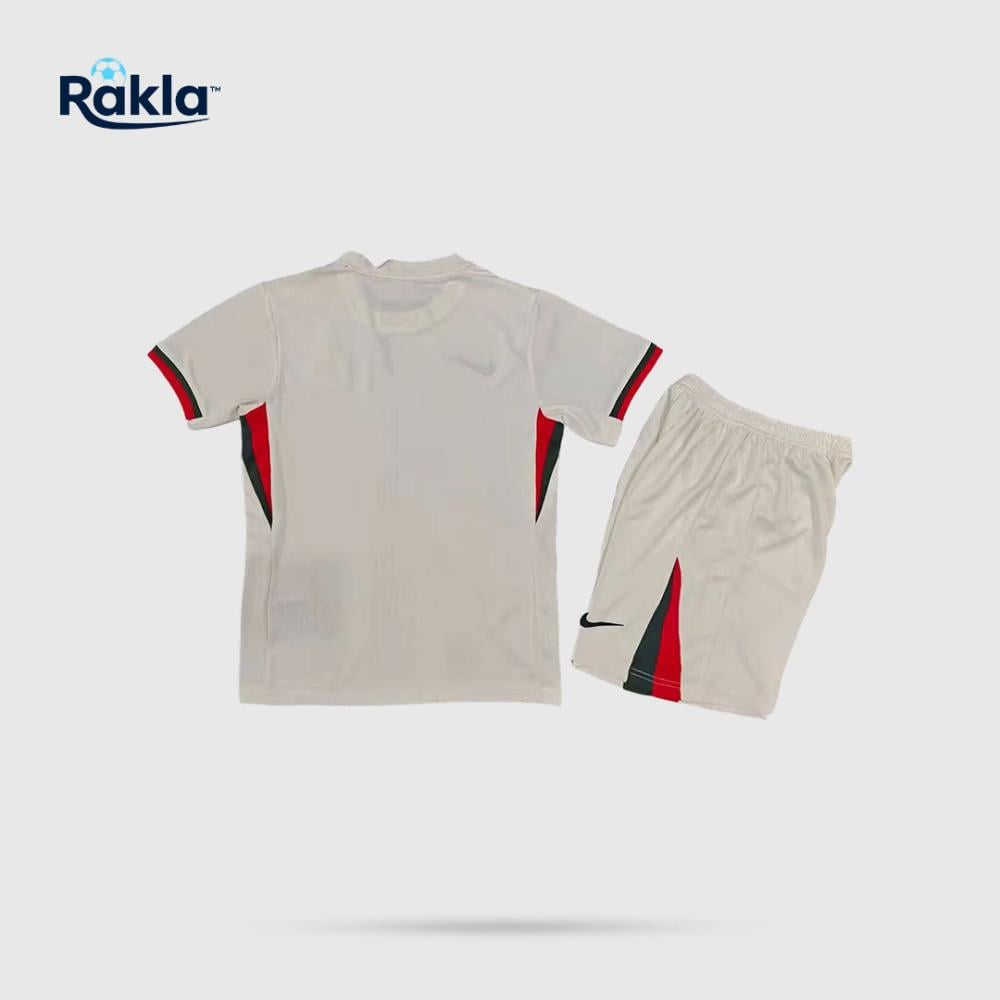 - اللون: يأتي الطقم باللون الأبيض الأساسي والذي يتداخل معه خطوط طولية دقيقة باللون الأحمر والأخضر تأتي في منتصف القميص وبالنسبة للشورت يأتي باللون الأبيض مع تداخل خط عريض من اللون الأخضر والأحمر بالإضافة إلى شعار النادي.