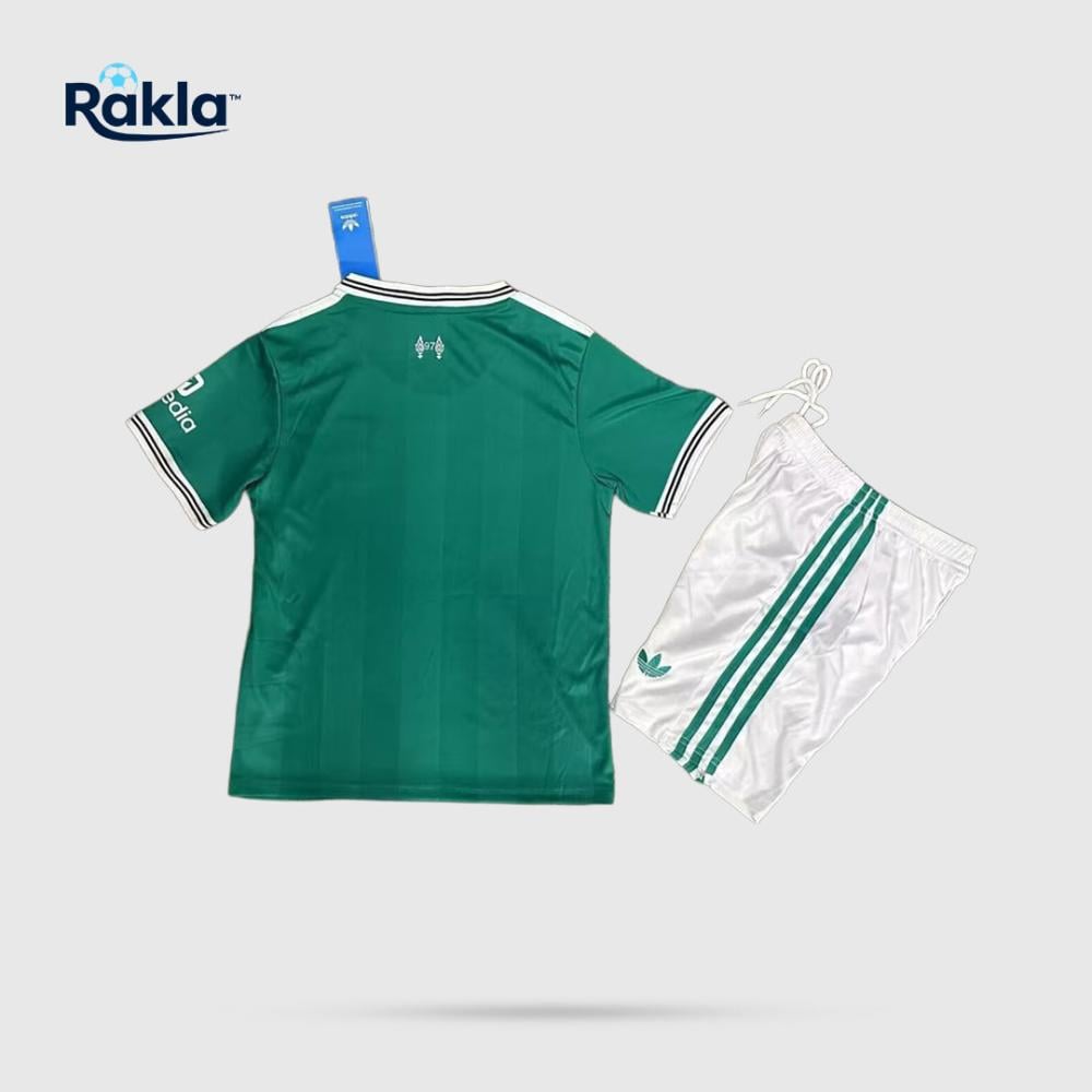 - اللون: أخضر فاتح (القميص) وأبيض (الشورت)، مع تفاصيل وشعارات باللون الأبيض والأخضر الداكن.
