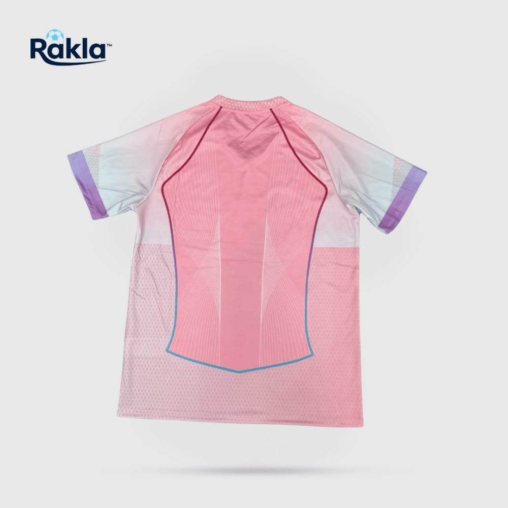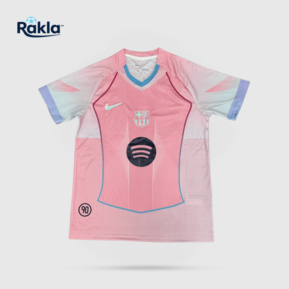 - التصميم: لون وردي جذاب يجمع بين الأناقة والجرأة، مع تفاصيل دقيقة وشعار برشلونة في منتصف التيشيرت ليبرز الهوية بوضوح.
